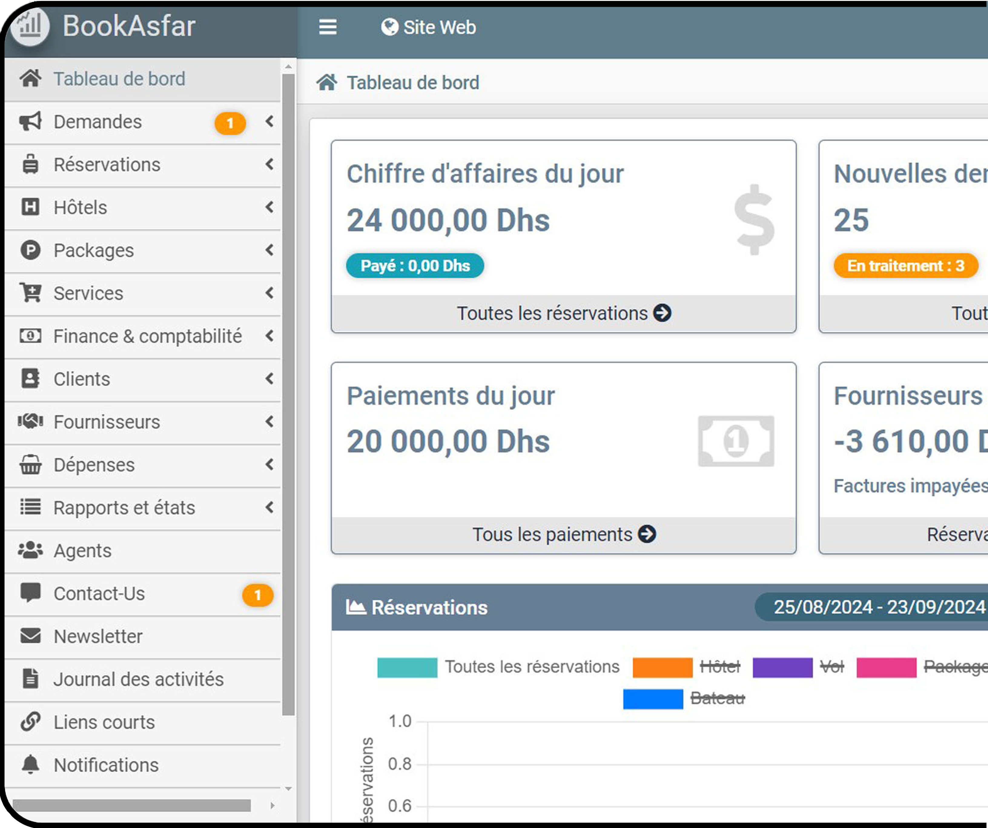 Avec BOOKASFAR, suivez et gérez vos réservations d'hôtels, de vols, et de packages touristiques en temps réel. Bénéficiez d'une gestion centralisée et simplifiée pour maximiser l'efficacité de votre agence de voyage et offrir une expérience fluide à vos clients.