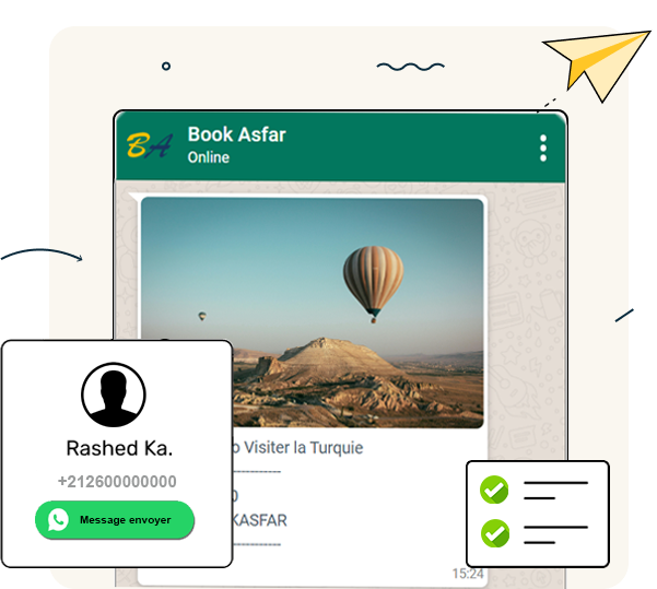 Avec BOOKASFAR, envoyez facilement des publicités ciblées à vos clients via l'API WhatsApp. Touchez vos utilisateurs potentiels directement et convertissez-les en clients fidèles grâce à des campagnes marketing automatisées et personnalisées, adaptées à leurs besoins.